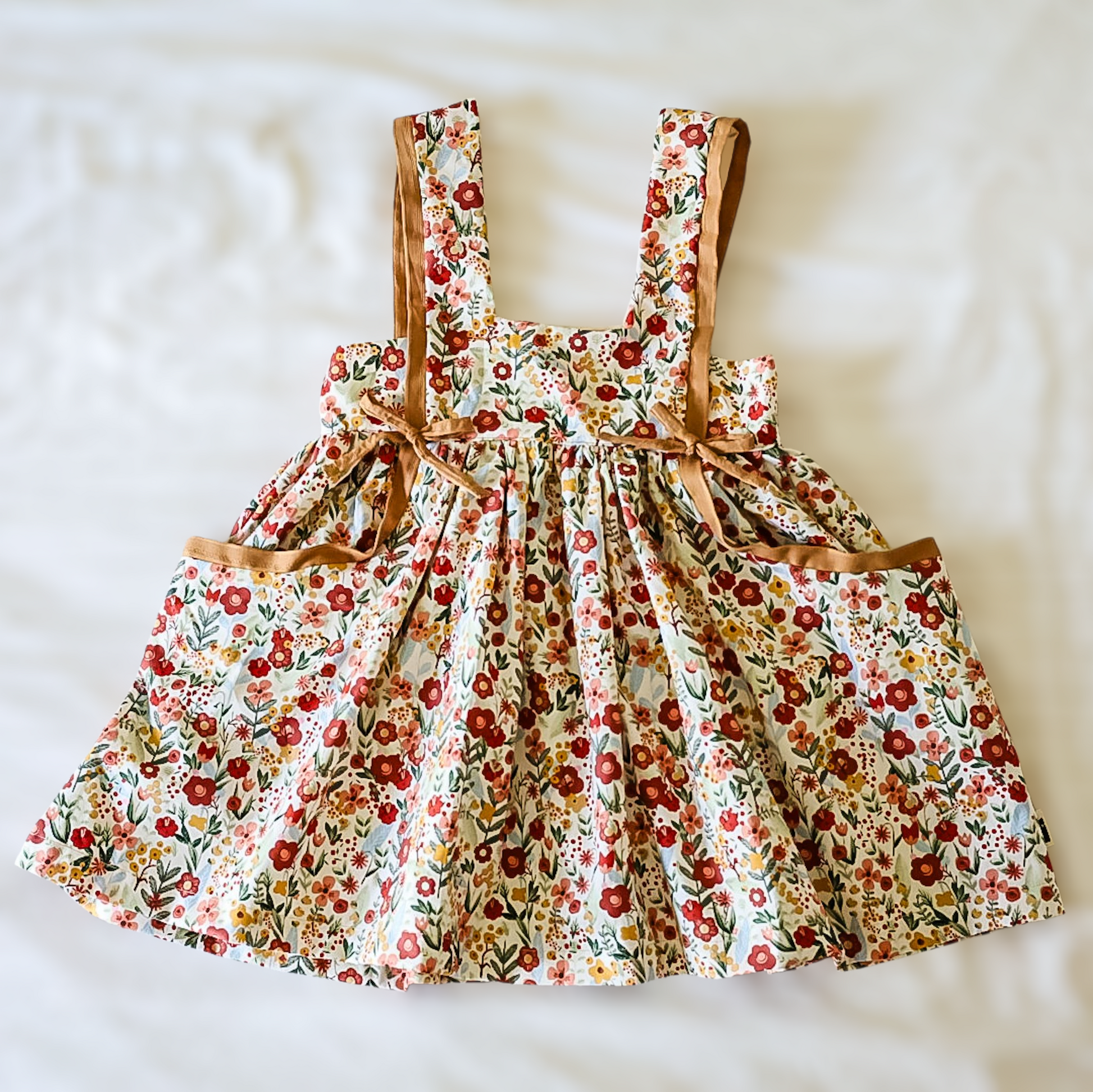 Celebrate the cozy charm of fall with this beautifully crafted fall floral pinafore, designed for effortless layering as the seasons shift. The rich autumn floral print is framed with warm brown bias trim, adding a touch of vintage elegance. Two sweet bows accent the front where the deep skirt pocket trims meet the bodice trim. Finished with natural coconut button closures at the back, this pinafore is as timeless as it is versatile and perfect for pairing with blouses, tees, or even over dresses all season long.