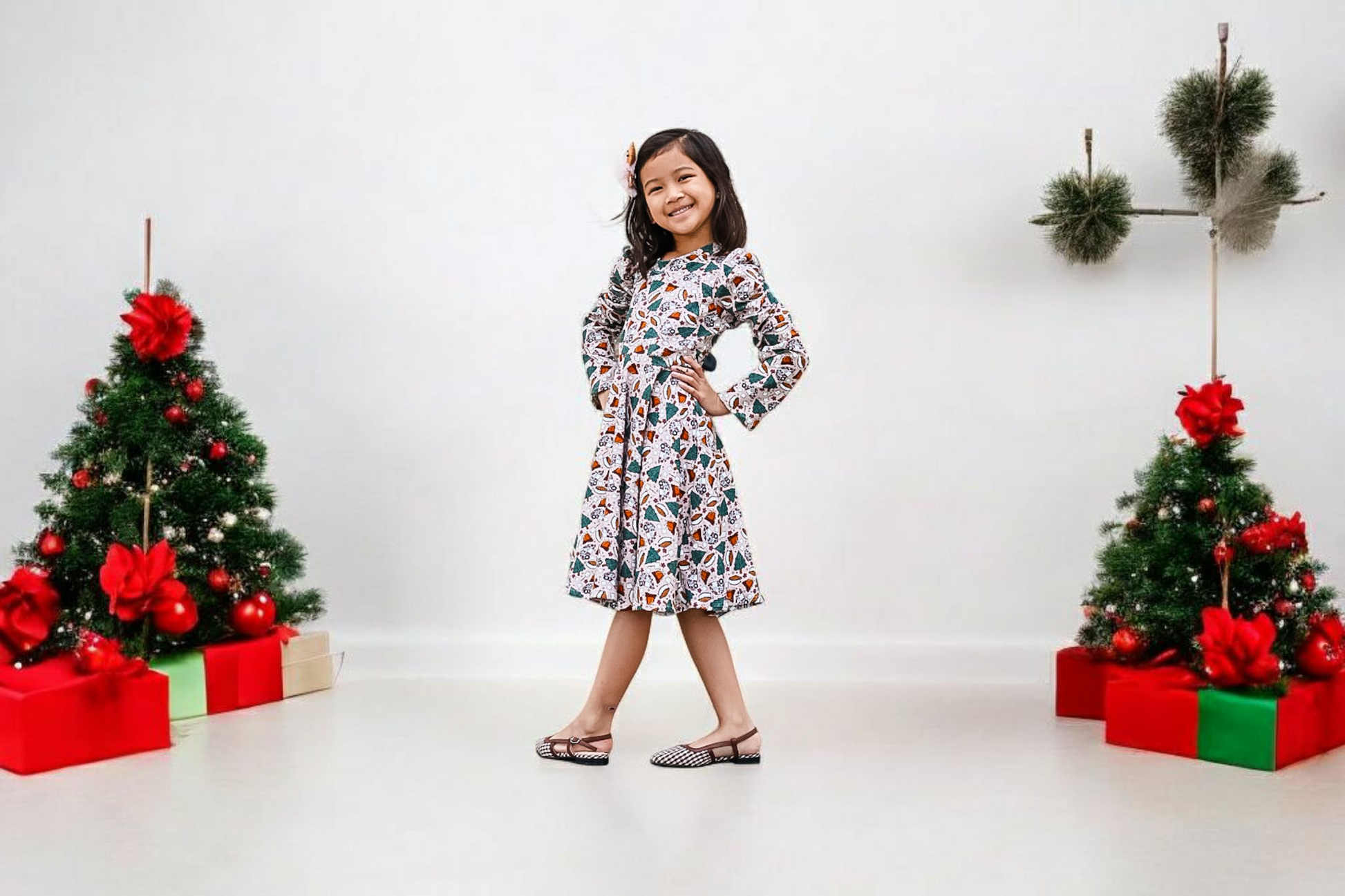 Available in short sleeves for daytime adventures or long sleeves for cool, cuddly evenings, this dress is made for comfort and maximum twirl — ideal for pumpkin patch days, winter bonfires, storytelling nights, and every memory in between.
