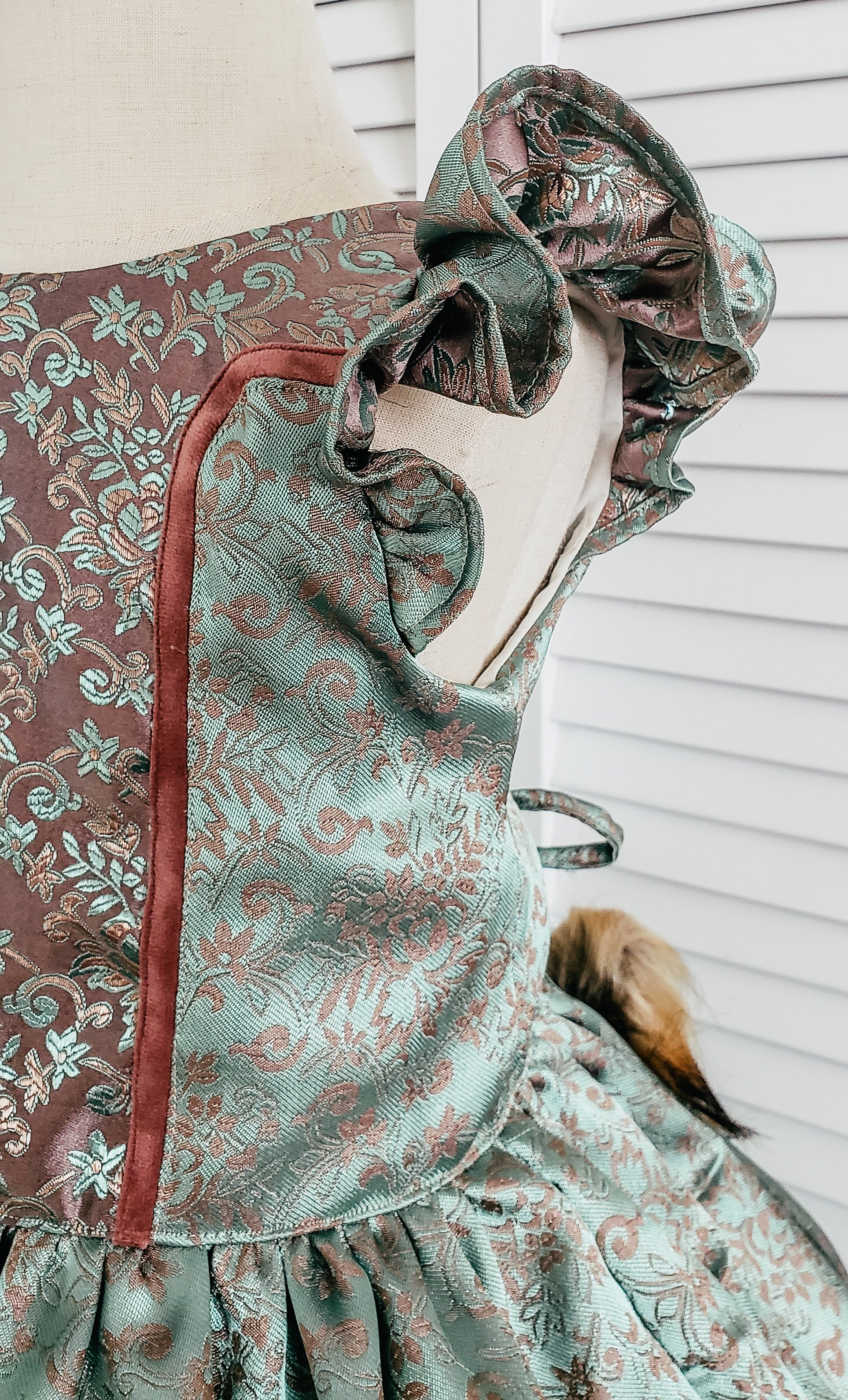 This stunning special occasion dress in wintergreen and mauvy pinky brown exudes elegance and charm. Featuring delicate flutter sleeves, the bodice is designed with princess seams for a flattering fit and an elastic back that ensures comfort, complemented by a corset tie and loops for an adjustable silhouette. Crafted from exquisite vintage baroque satin, this dress showcases a luxurious sheen, while velvet trimmings add a touch of opulence. The cotton lining ensures a soft feel against the skin, making it perfect for any special event where style meets comfort.